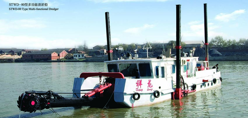 我公司研制的STWD-80多功能清淤船是"十五"期間國家重大技術裝備研制項目,通過部級鑒定,該船具備水炮沖刷、射流拖淤、斗輪挖泥三種清淤功能,適用于內河及潮水泥含量高的江河入海口、港道和堤岸,清淤效果顯著。射、拖、挖裝置共用一套動力系統,設備利用率高。